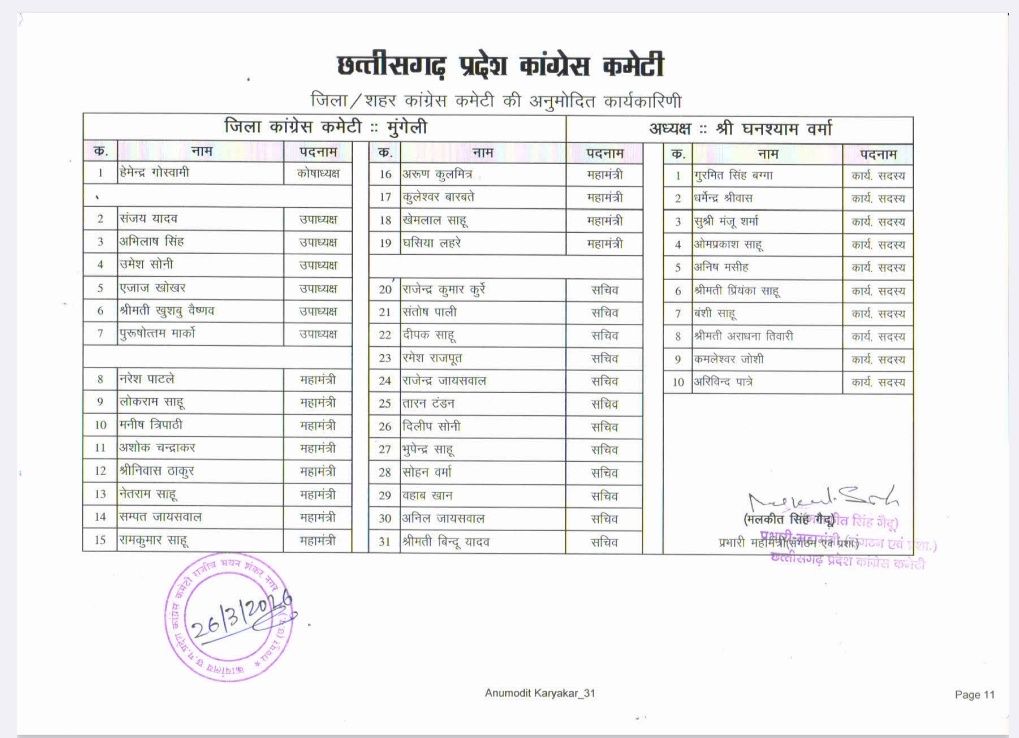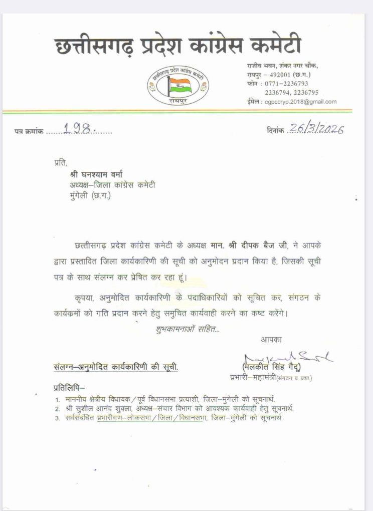 सरगांव। जिला कांग्रेस कमेटी मुंगेली की नई कार्यकारिणी की घोषणा हो गई है। जिलाध्यक्ष घनश्याम वर्मा ने प्रदेश कांग्रेस अध्यक्ष दीपक बैज के अनुमोदन के बाद पदाधिकारियों की सूची जारी की। इसमें संगठनात्मक संतुलन पर खास जोर दिया गया, जिससे कार्यकर्ताओं में जोश भर आया है।