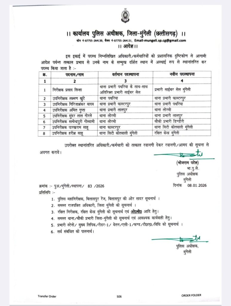 मुंगेली। मुंगेली जिले के पुलिस महकमे में बड़े पैमाने पर फेरबदल किया गया है। जिले के पुलिस अधीक्षक भोजराम पटेल ने प्रशासनिक दृष्टिकोण से स्थानांतरण आदेश जारी कर दिए हैं। नई स्थानांतरण सूची के अनुसार, जिले के विभिन्न थानों के थाना प्रभारी, उप निरीक्षक, सहायक उप निरीक्षक, सिपाही और प्रधान आरक्षक सहित कुल 45 पुलिसकर्मियों को इधर-उधर किया गया है। यह फेरबदल पुलिस व्यवस्था को और मजबूत बनाने के उद्देश्य से किया गया है। जारी आदेश में निरीक्षक प्रसाद सिन्हा को थाना पथरिया के साथ ही अतिरिक्त प्रभार देते हुए मुंगेली सायबर सेल का प्रभारी बनाया गया है।