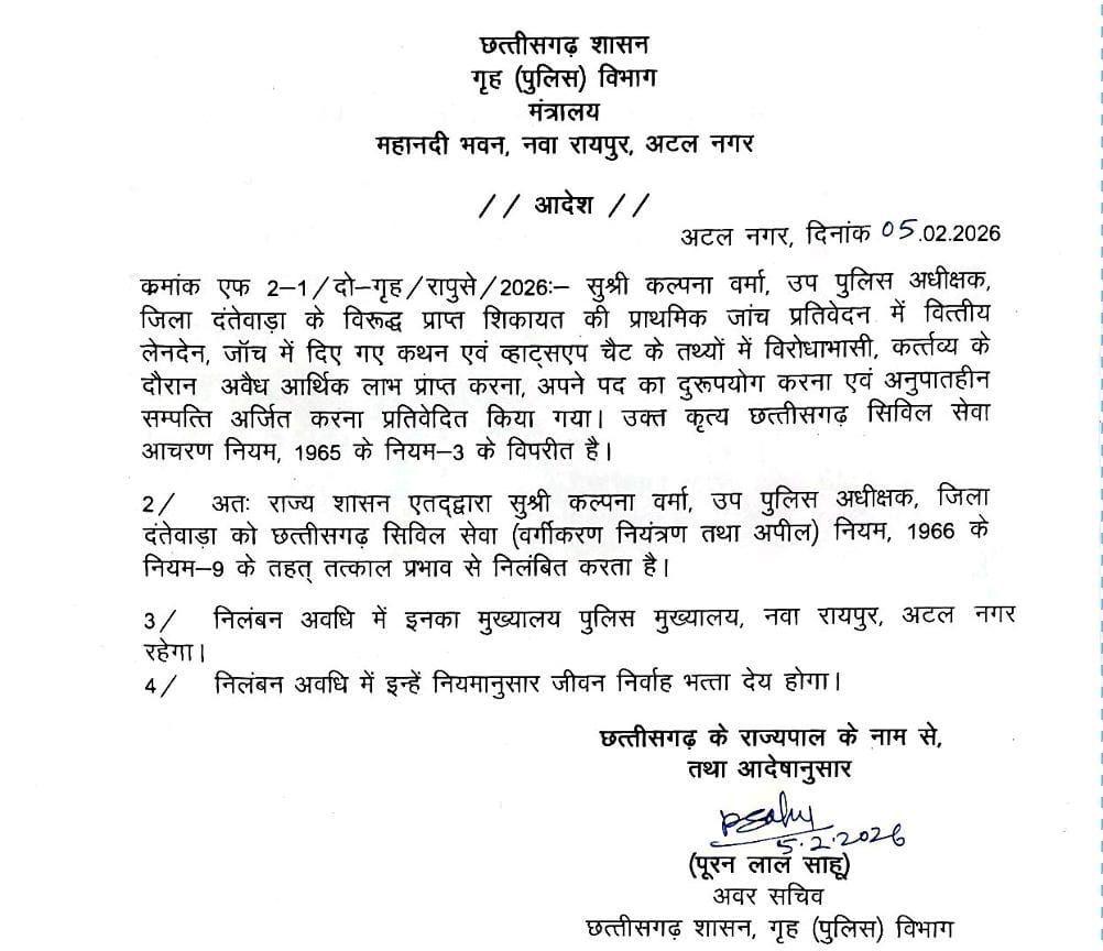 इसी आधार पर गृह (पुलिस) विभाग, छत्तीसगढ़ ने आदेश जारी कर डीएसपी कल्पना वर्मा को छत्तीसगढ़ सिविल सेवा (वर्गीकरण, नियंत्रण एवं अपील) नियम 1966 के नियम-9 के तहत तत्काल प्रभाव से निलंबित कर दिया है। निलंबन अवधि के दौरान उनका मुख्यालय पुलिस मुख्यालय, नवा रायपुर, अटल नगर निर्धारित किया गया है और उन्हें नियमानुसार जीवन निर्वाह भत्ता दिया जाएगा।